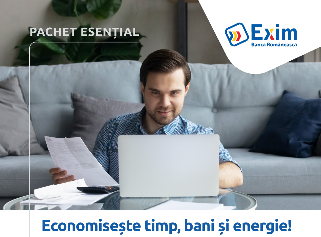 Bucuresti, 04 iulie 2023 – Exim Banca Romaneasca pune la dispozitia persoanelor fizice platforma e-bancamea.ro prin care ofera acces facil, rapid si sigur, 100% online, la un pachet complet de produse si servicii: cont curent in lei, card de debit (Mastercard Gold), serviciul SMS Alert si Internet Banking, reunite sub denumirea Pachet eSential.