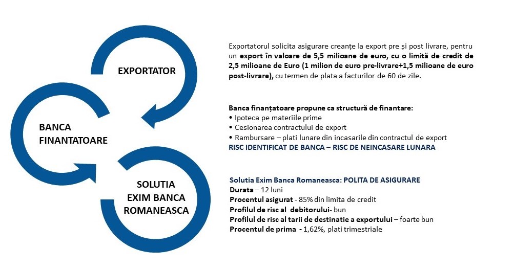 Pana la 31 decembrie 2026, Exim Banca Romaneasca poate prelua riscurile pe termen scurt la care sunt expuse intreprinderile mici, mijlocii si mari, indiferent de volumul cifrei de afaceri la export, numarul de parteneri externi pe care doreste sa ii asigure, pe o perioada a riscului (care include durata de fabricatie si durata de rambursare) de pana la doi ani.