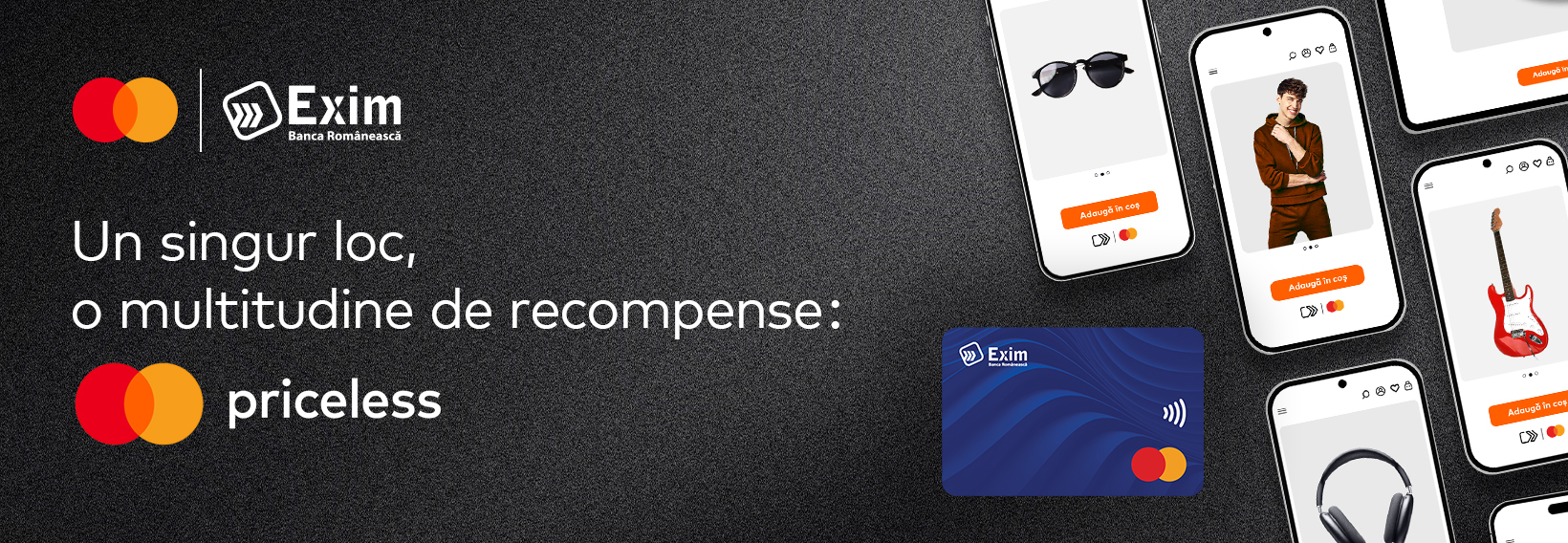 Plateste cu cardul tau Exim Banca Romaneasca Mastercard in magazinele Mobexpert sau online pe Mobexpert.ro si poti castiga unul dintre cele 15 carduri cadou in valoare de 2.500 lei fiecare.