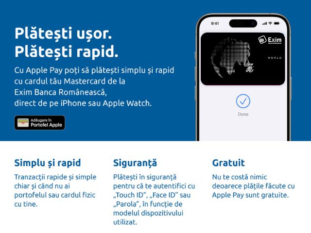 Da, utilizarea Apple Pay este gratuita, atat in tara, cat si in strainatate, iar platile cu telefonul mobil sunt realizate fara taxe sau comisioane.