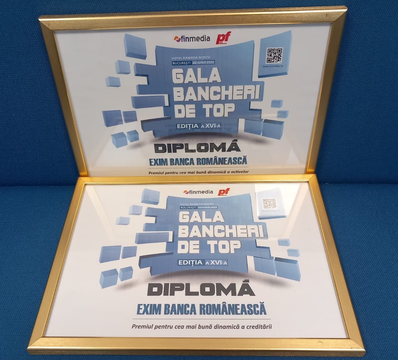 Performantele financiare din 2022 ale Exim Banca Romaneasca au fost recunoscute in cadrul Galei Bancheri de Top, organizata de revista „Piata Financiara”, banca fiind recompensata cu ”Premiul pentru cea mai buna dinamica a creditarii” si ”Premiul pentru dinamica activelor”.