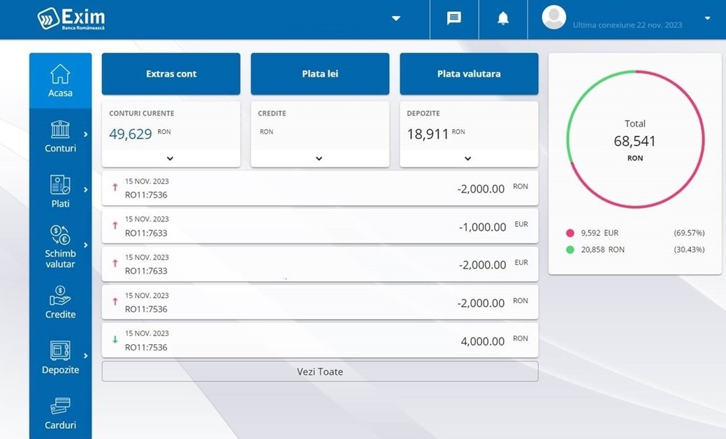 Exim Banca Romaneasca face inca un pas pentru a oferi clientilor sai persoane fizice o experienta de banking digitala imbunatatita si lansează, din 27 noiembrie 2023, o noua interfata pentru aplicatia de Internet Banking.