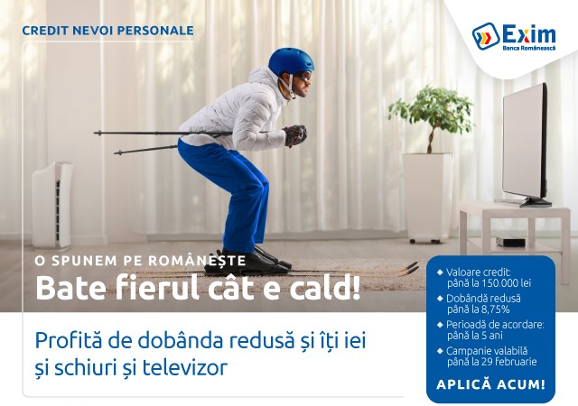 Exim Banca Romaneasca a lansat de 1 Decembrie o campanie promotionala prin care creditele de consum cu dobanda fixa sunt disponibile cu o dobanda redusa. Astfel, persoanele fizice au posibilitatea de a accesa, pana pe 29 februarie 2024, credite de nevoi personale cu o dobanda fixa de 8,75%, redusa cu 2,25 puncte procentuale fata de dobanda fixa standard.