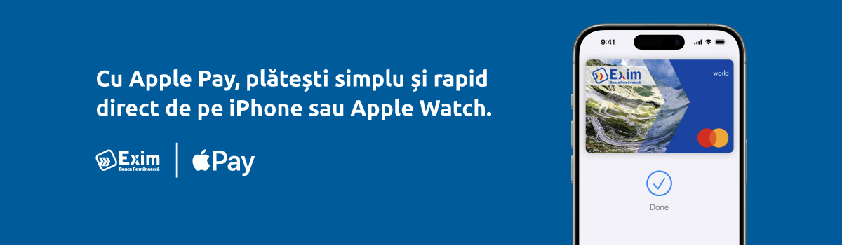 Exim Banca Romaneasca introduce in portofoliul sau serviciul Apple Pay oferind clientilor bancii posesori de carduri posibilitatea de a efectua plati contactless rapide si sigure la terminalele POS, direct cu telefoanele cu sistem de operare iOS sau ceas inteligent Apple Watch, fara a fi necesara prezenta fizica a cardului.