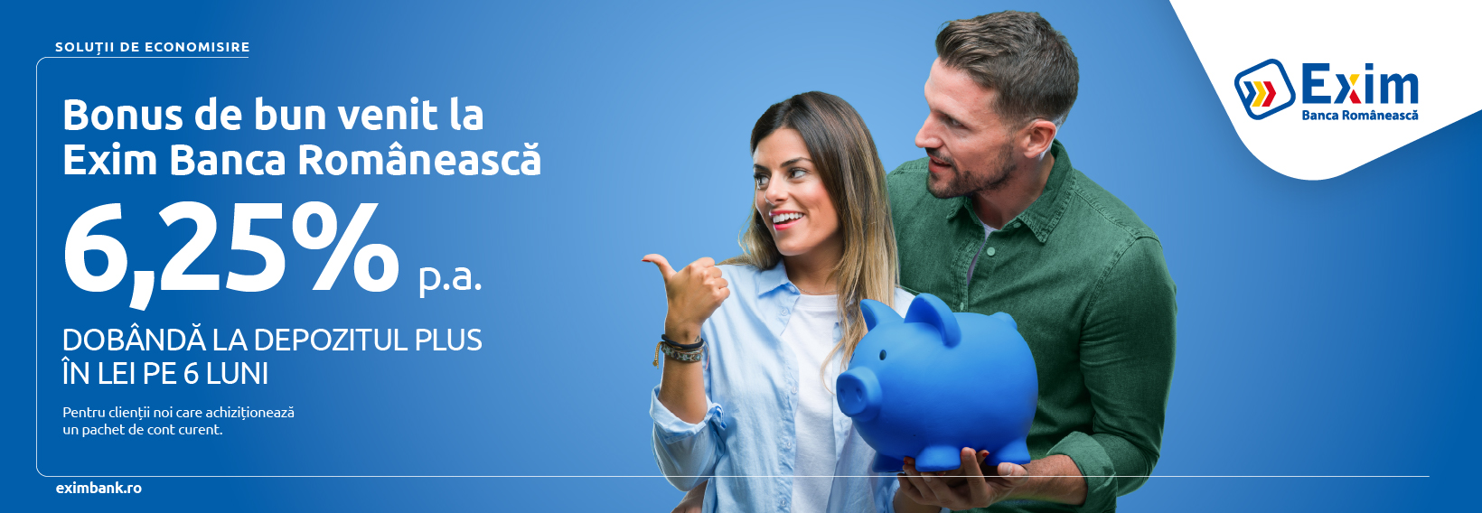 Pentru persoanele fizice, clienti existenti, care vor sa economiseasca, Exim Banca Romaneasca mentine oferta de dobanda de 6,10% p.a. pentru Depozitul PLUS in lei constituit din fonduri noi pe o perioada de 6 luni.