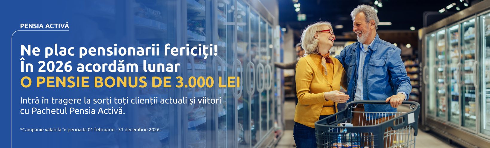 • Ne plac pensionarii fericiti! In 2026, toti cei care detin sau aleg Pachetul de cont Pensia Activa au sansa, fiecare luna, sa castige prin tragere la sorti o pensie bonus de 3.000 de lei.