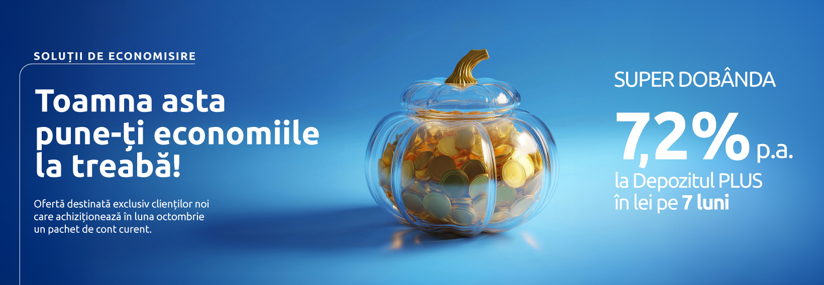 Oferta este disponibila atat pentru Depozitul PLUS in lei, cat si pentru Depozitul PLUS in euro aducand beneficii suplimentare persoanelor fizice care achizitioneaza, in luna octombrie, un pachet de cont curent.