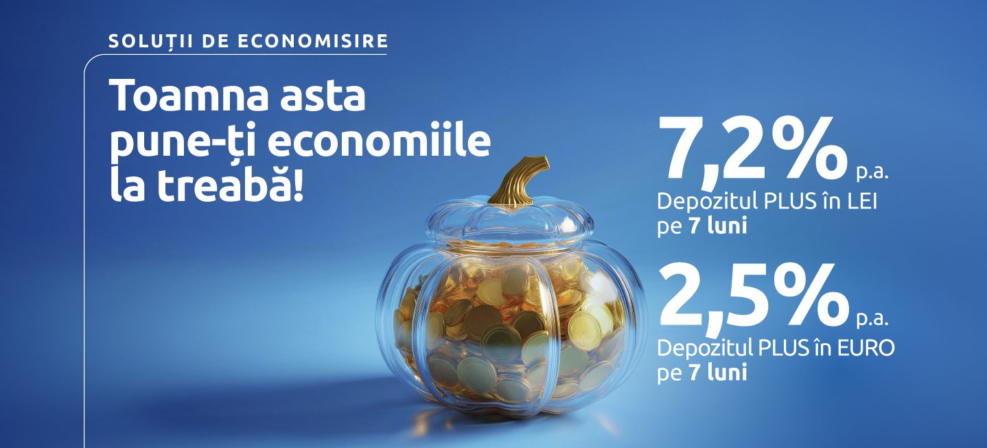 Astfel, clientii noi, care deschid un cont curent in cadrul unui pachet de cont, pot constitui un Depozit PLUS in lei, din fonduri noi, pe o perioada de 7 luni, cu o dobanda de de 7,20% p.a., sau un Depozit PLUS in euro, din fonduri noi, pe o perioada de 7 luni, cu o dobanda de 2,50% p.a.