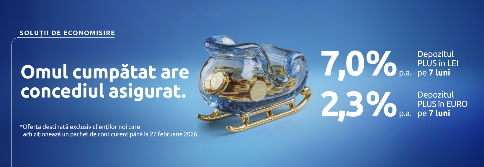 Oferta este disponibila atat pentru Depozitul PLUS in lei, cat si pentru Depozitul PLUS in euro aducand beneficii suplimentare persoanelor fizice care achizitioneaza, pana la 27 februarie 2026, un pachet de cont curent.