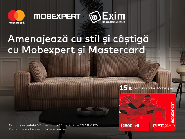 Pay with your Exim Banca Românească Mastercard at Mobexpert stores or online at Mobexpert.ro and you could win one of 15 gift cards worth 2,500 lei each.