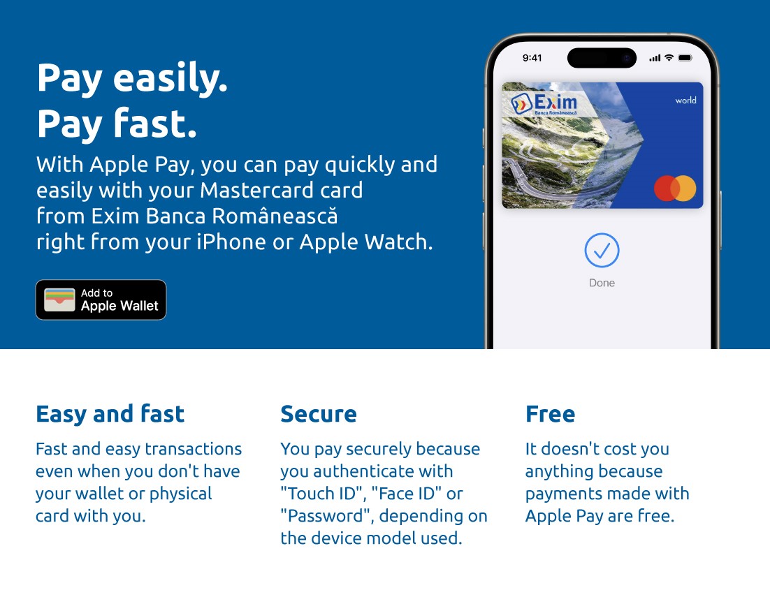 Yes, the use of Apple Pay is free, both in the Romania and abroad, and mobile payments are made without taxes or commissions.