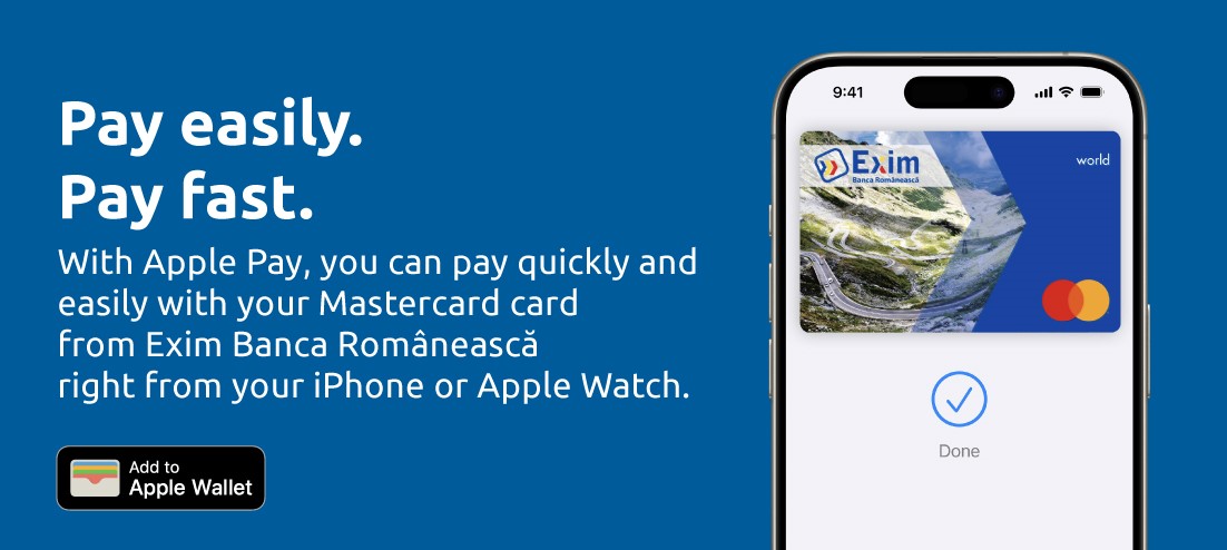 Exim Banca Romanească introduces in its portfolio the Apple Pay service, offering the cardholder bank customers the possibility to make fast and secure contactless payments at the POS terminals, directly with iPhone or with Apple Watch without the need for the physical presence of the card.